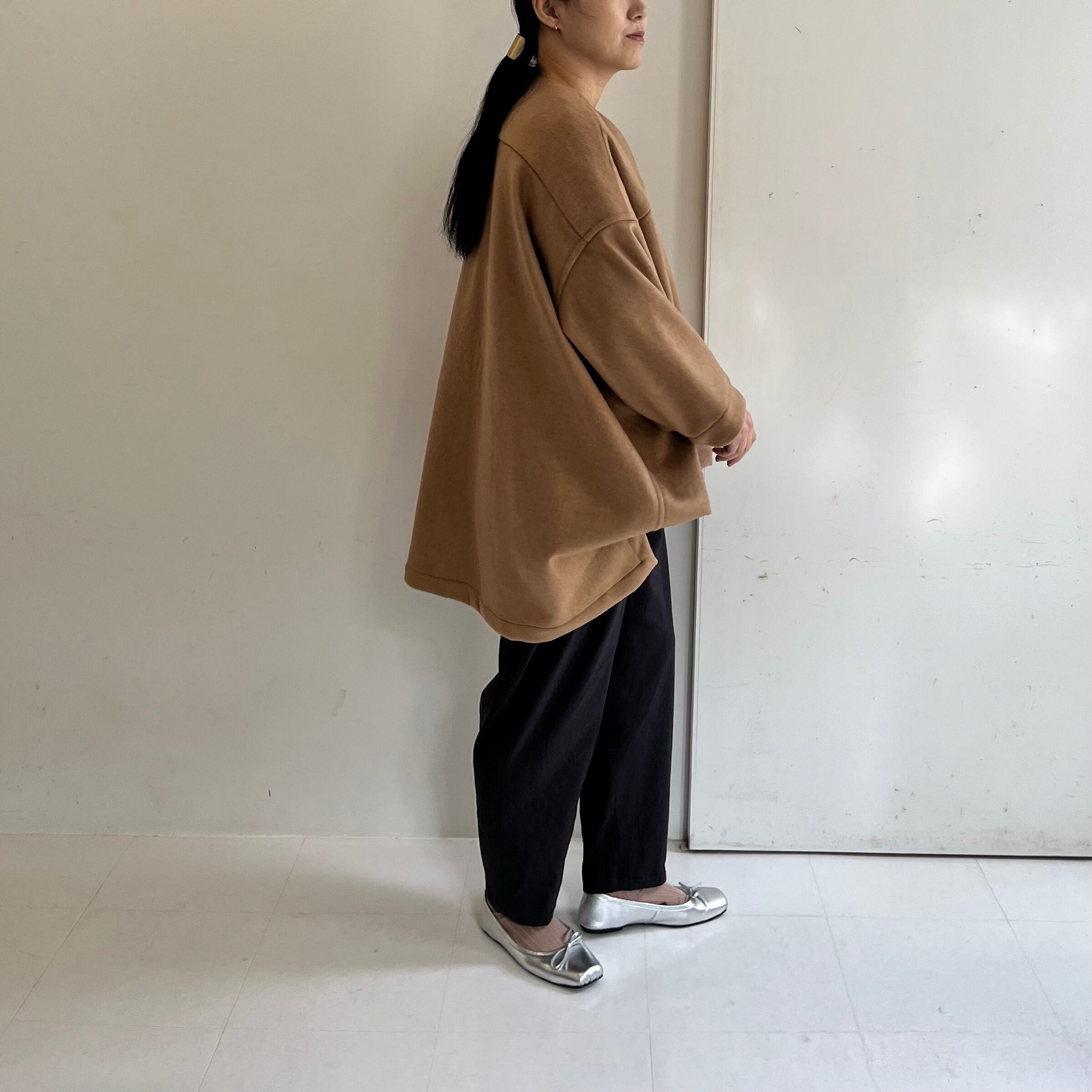 前ヨークにスリット開きがあり、脱ぎ着はかぶることからポンチョのように着こなして頂けたらと思います。