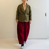 カーキ色は黒やベージュとも合わせやすく、また写真のような赤や明るめのカラーとも相性が良いです。サッと羽織れるこだわりの上着としていかがでしょうか。