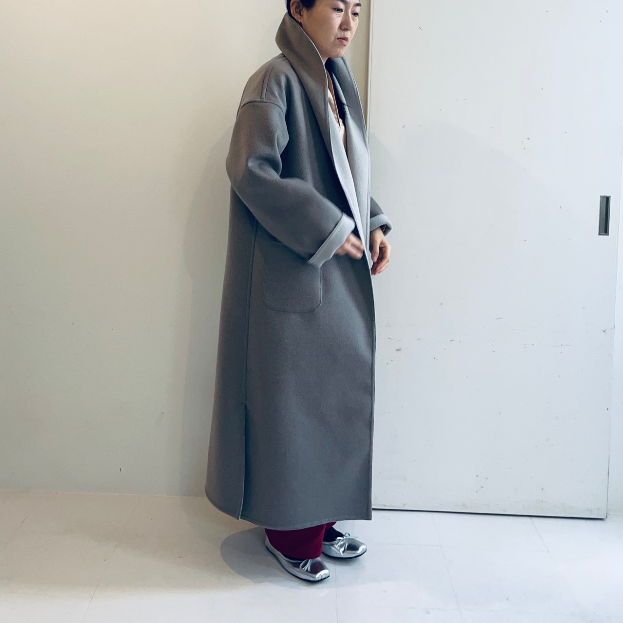 デザインは、ドロップした肩とスッキリした身頃でさらりと羽織れるコートです。