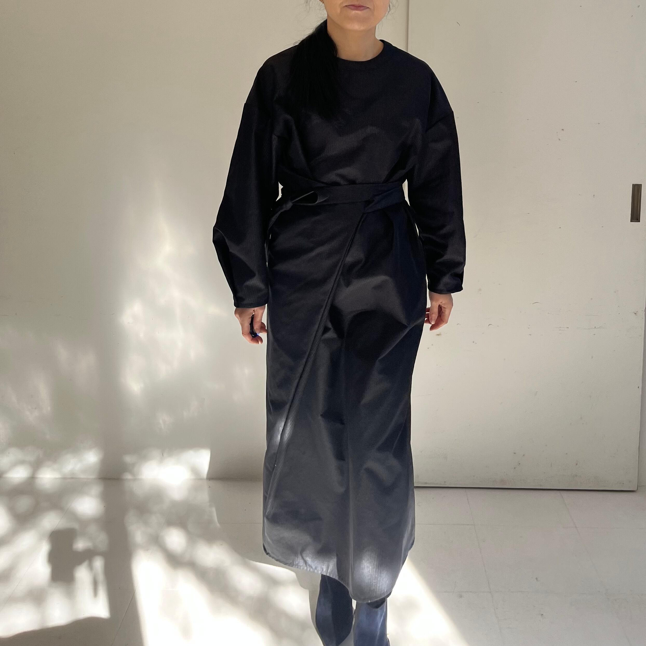 ベースはロングタイトシルエットで、ウエストマークするとIラインのシルエットになり、スタイルアップして見えるのでお勧めです。