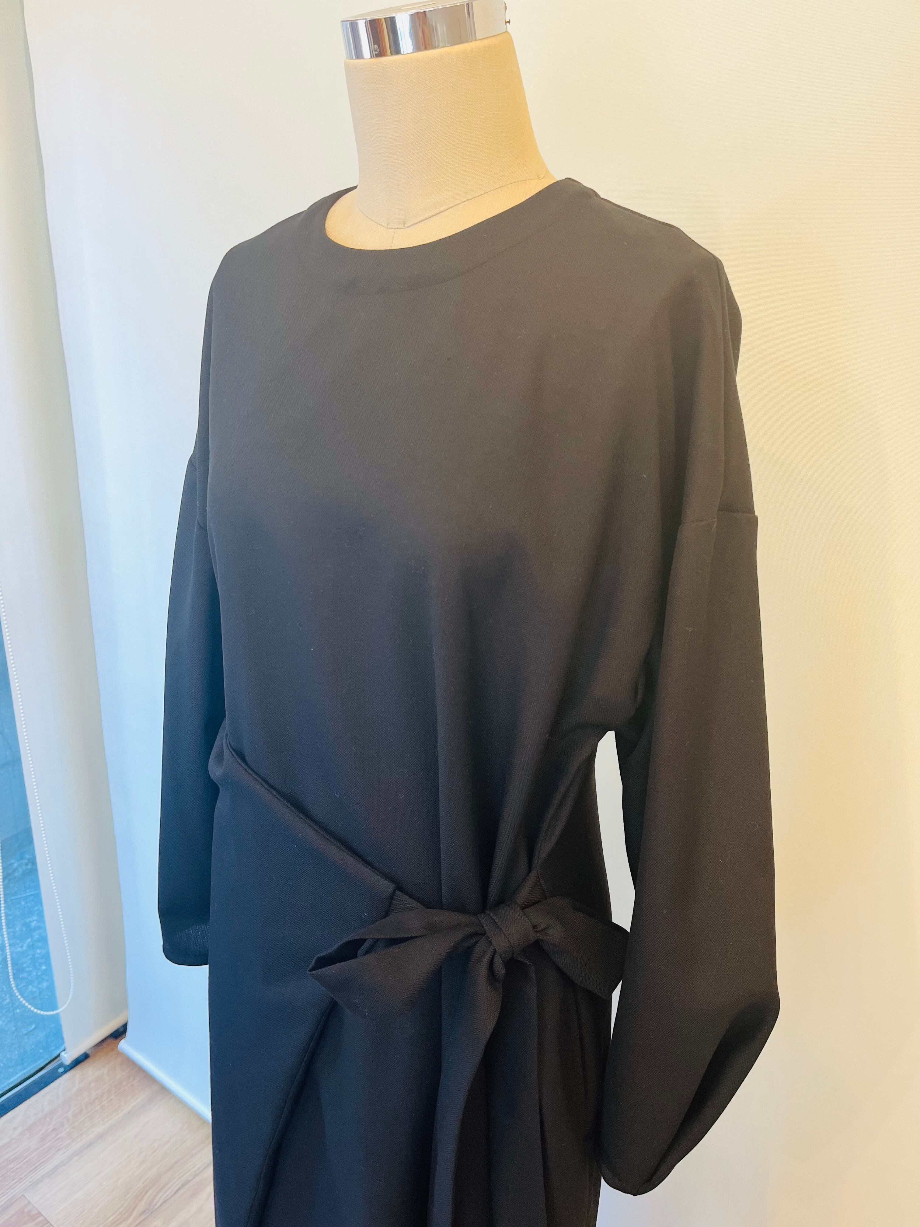 デザインは、右脇下から広がった布を前に巻き付けてリボン結びしたり、リボンをベルトのようにウエストに巻き付けてウエストマークしたりと、色々なアレンジが効くものになっています。